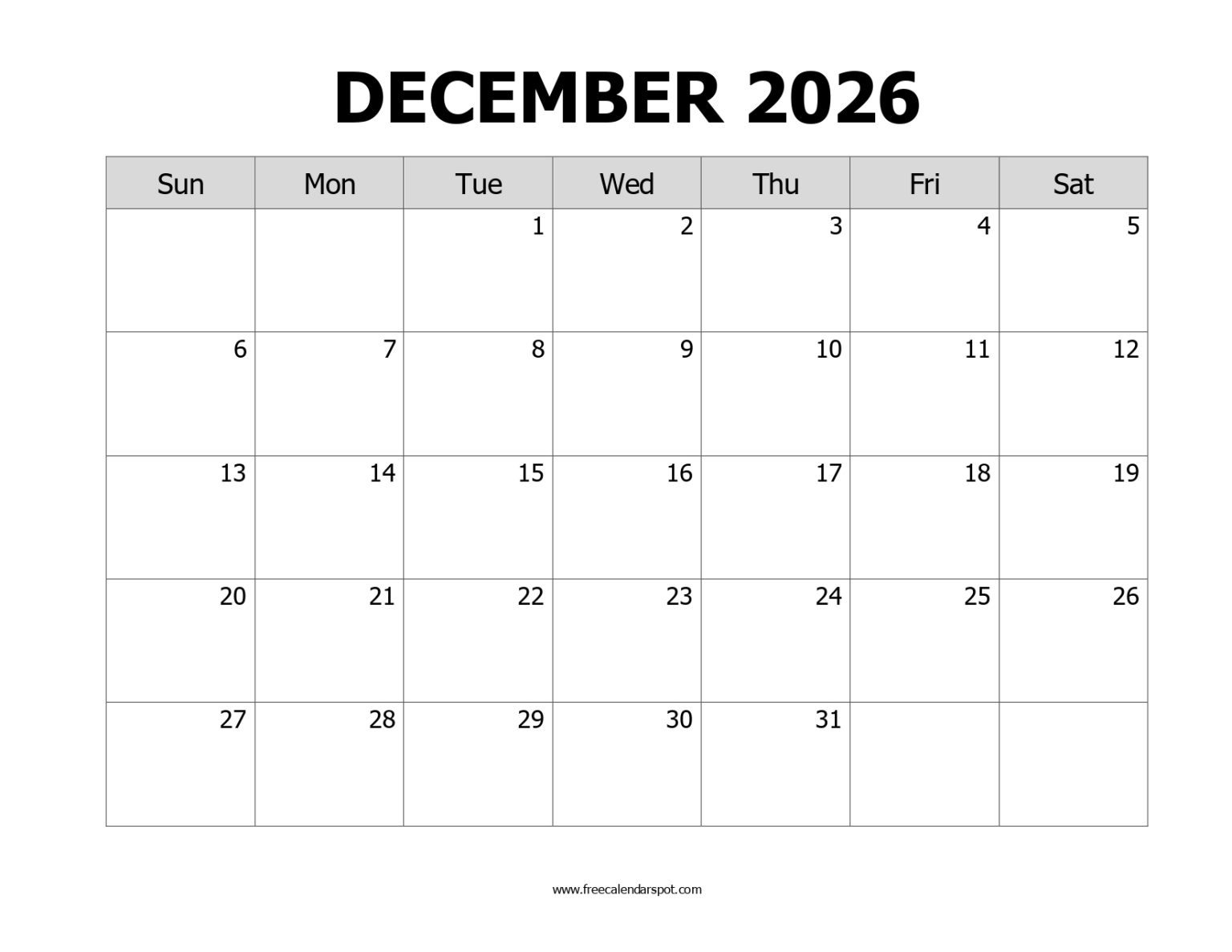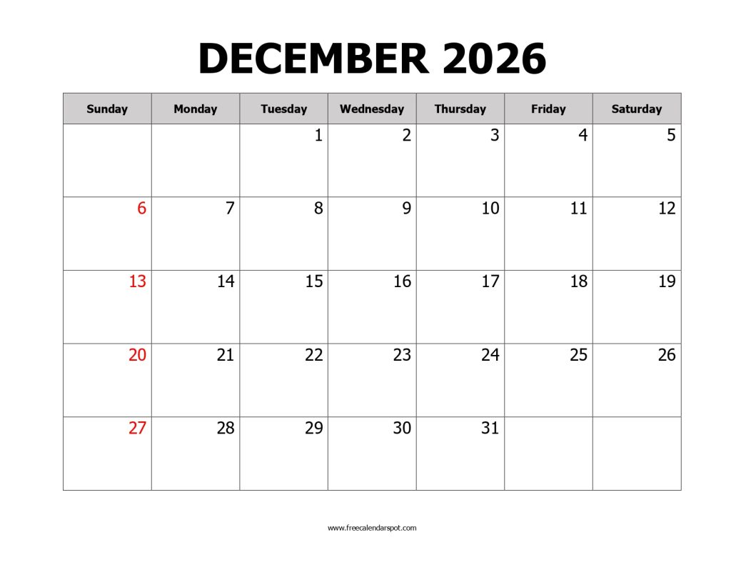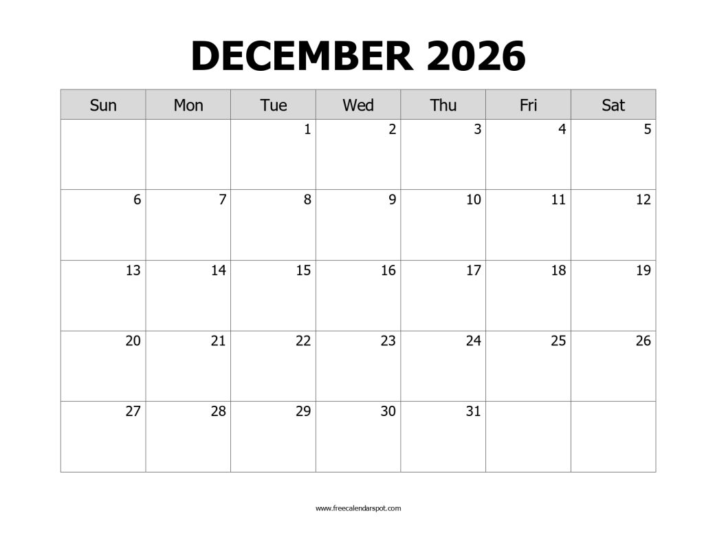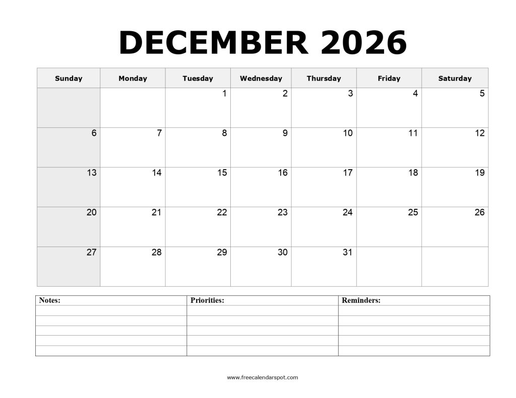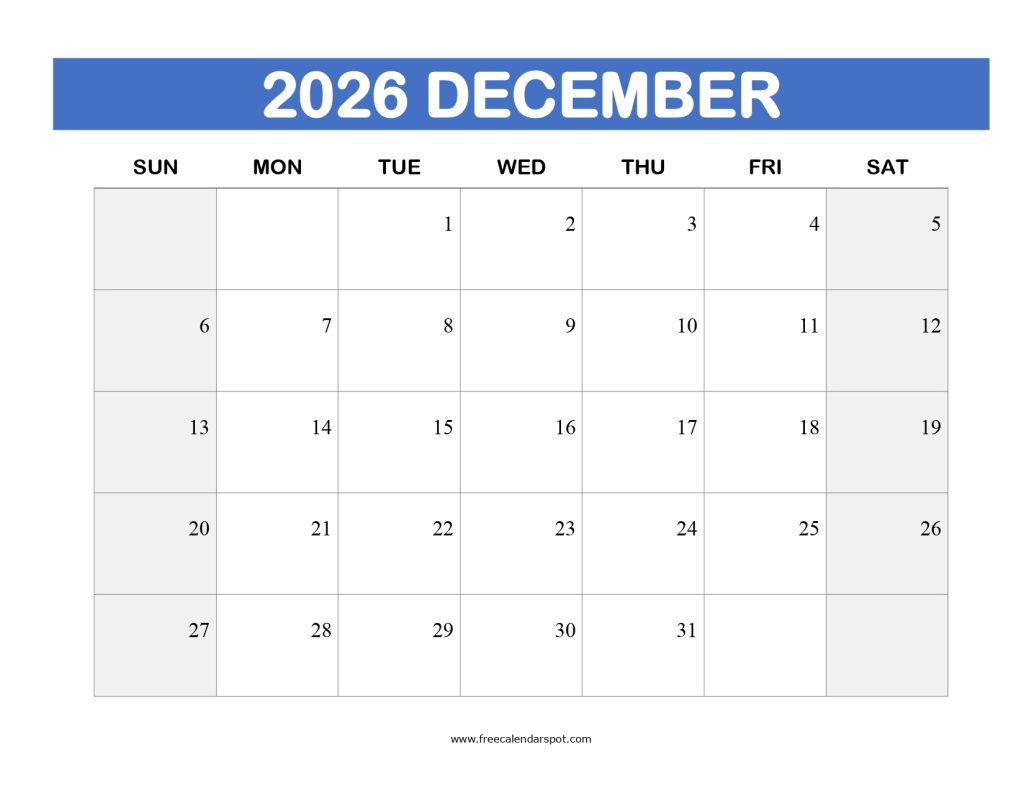 December 2026 is a month to achieve your yearly goals or objectives. This is the month to celebrate Christmas and get ready to welcome the new year. Enjoy the holiday period and make some good memories with your friends or dear ones. Weather varies across the United States with some areas experiencing snowfall while other may have milder weather or even sunshine. Use printable December 2026 calendar to organize this month. Happy December!